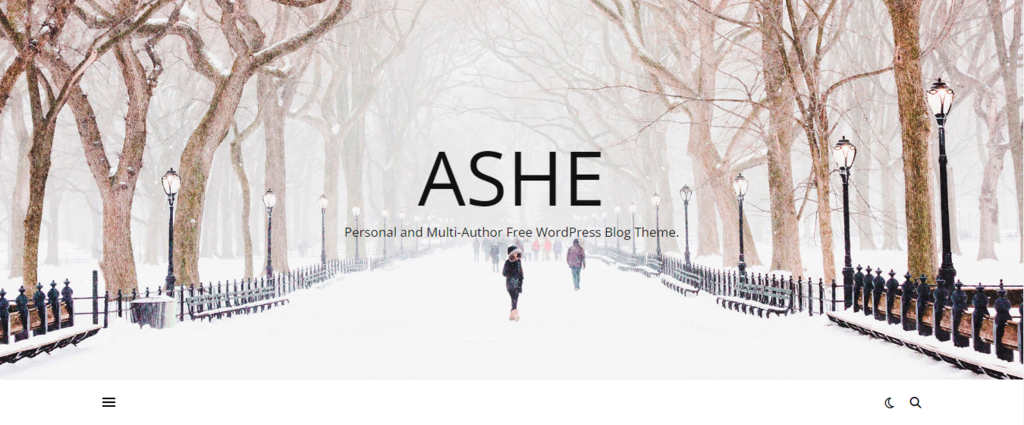 Ashe est l’un des meilleurs thèmes gratuits pour les sites web de photographie sur WordPress. Son design minimaliste et réactif garantit une excellente lisibilité sur tous les appareils. Les visiteurs peuvent alterner entre les thèmes clair et foncé et utiliser la fonction de recherche pour parcourir les différents articles du blog.