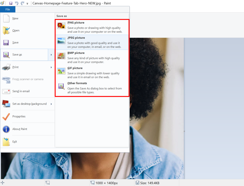 - Utilisez Microsoft Paint. Si vous utilisez Windows, enregistrez l’image WebP. Ensuite, ouvrez-la dans Microsoft Paint. Allez dans Fichier -> Enregistrer sous. Choisissez votre format préféré.
