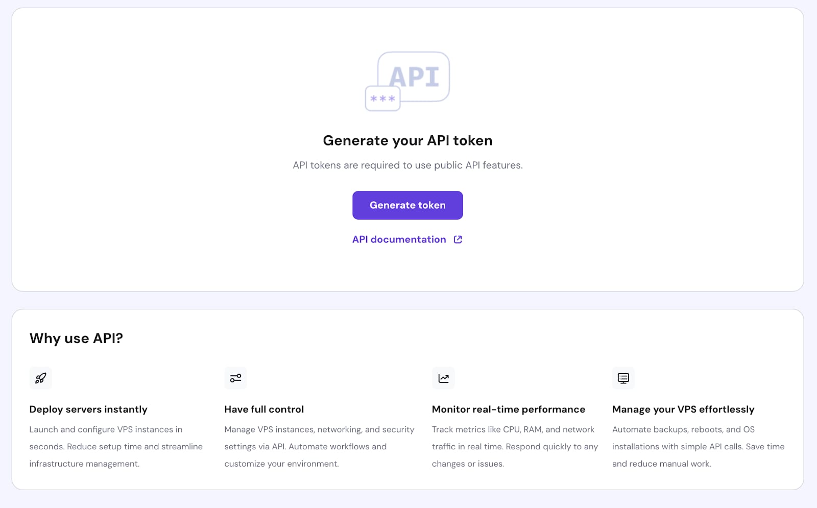 Dengan Hostinger API, Anda bisa berinteraksi dengan akun Hostinger Anda secara terprogram. Tak perlu lagi memeriksa statistik server atau mengelola VPS Anda secara manual, cukup masukkan beberapa perintah sederhana di API Anda. Anda bisa menyesuaikan dashboard, mengatur peringatan otomatis, atau bahkan mengintegrasikan pengelolaan hosting Anda ke tool lain yang sudah ada.