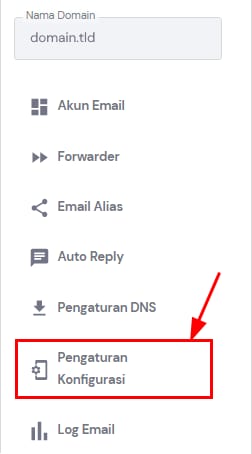 Konfigurasi default untuk email di akun Anda dapat dicek melalui bagian Email→ nama domain → Pengaturan Konfigurasi: