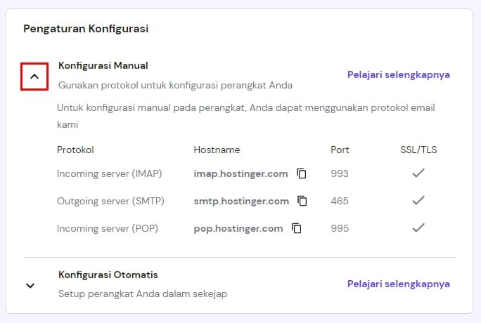 Detail konfigurasi email tertera di bagian Pengaturan Konfigurasi → Konfigurasi Manual: