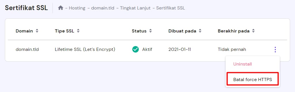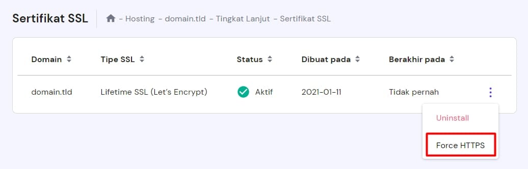 Jika ingin mengaktifkan kembali HTTPS, pilih Force HTTPS pada halaman yang sama: