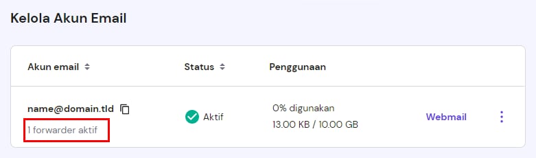 Informasi tambahan seperti alias atau forwarder akan ditampilkan di bagian Kelola Akun Email: