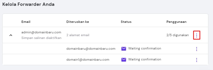 Anda dapat melihat forwarder yang sudah dibuat di bagian Kelola Forwarder Anda. Jika sebuah email memiliki lebih dari satu forwarder, maka email forwarder akan dikelompokkan di panah ↓ :