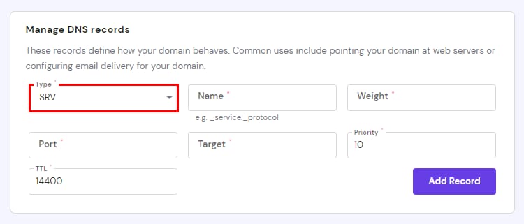 Menambah SRV record baru dan mengelola SRV record yang sudah ada di Hostinger