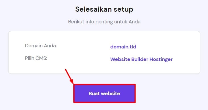 Kemudian, pilih nama domain yang ingin digunakan dan konfirmasi detail yang tertera. Untuk mengubah nama domain atau platform, cukup klik ikon pensil di sampingnya. Setelah memastikan semua sudah benar, klik Buat website: