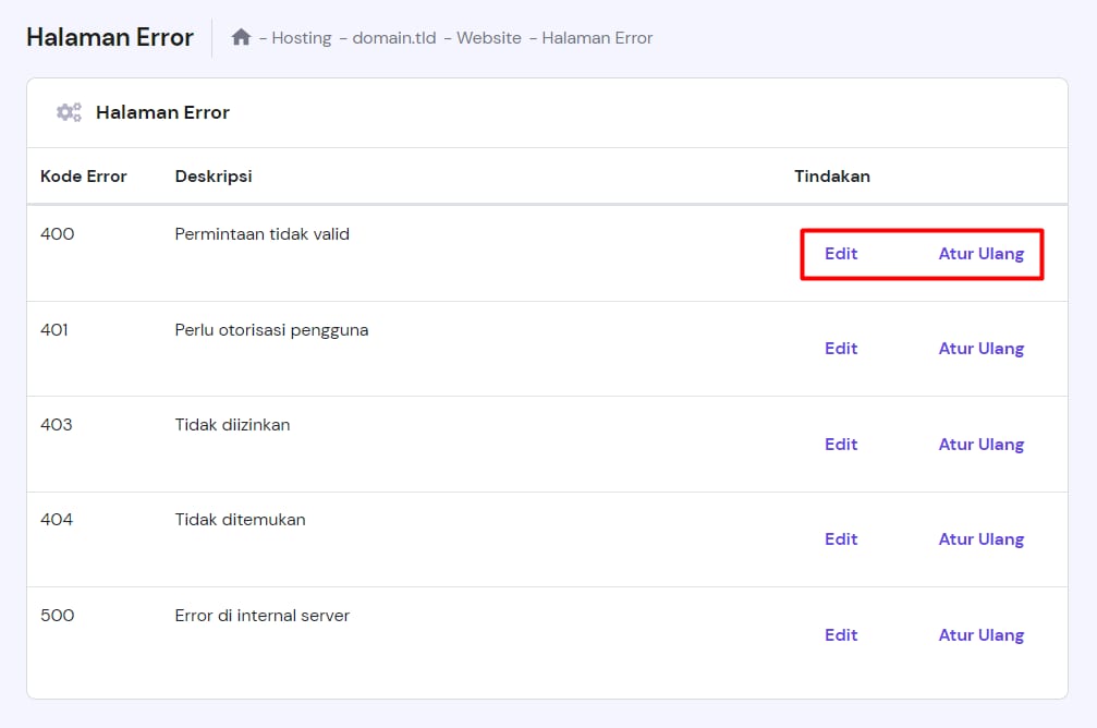 Di menu ini, Anda dapat mengedit tiap Kode Error secara terpisah, bahkan menggunakan code HTML Anda sendiri. Halaman error default juga dapat direstore ke default dengan mengklik Reset: