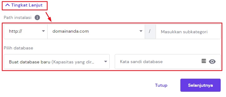 Jika Anda ingin memilih subdirektori khusus atau menggunakan database yang sudah ada, klik Tingkat Lanjut dan isi detail yang diperlukan: