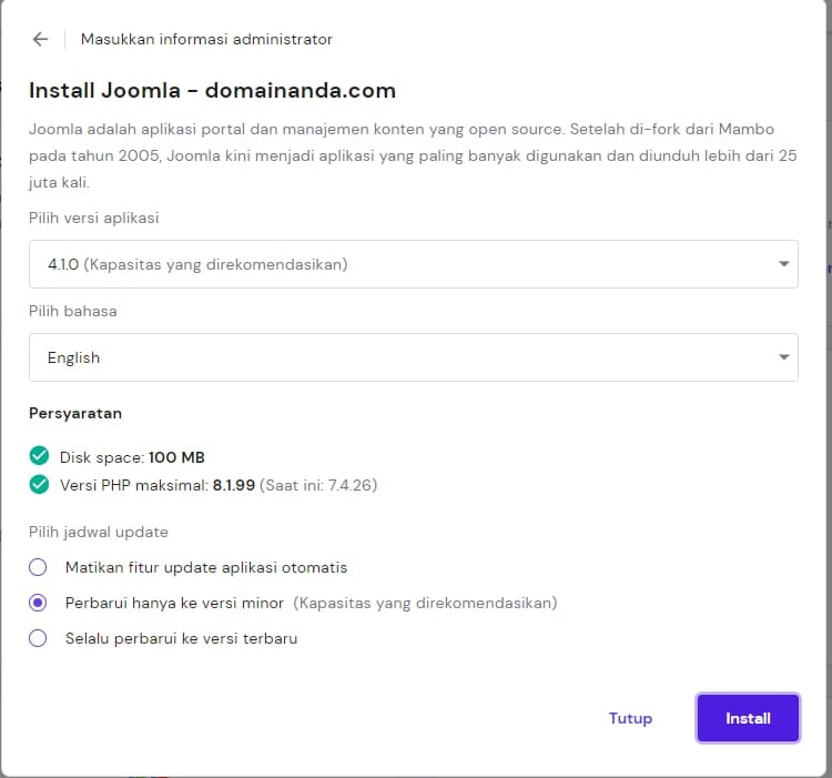Setelah itu, klik Selanjutnya. Di jendela yang terbuka, atur pilihan versi aplikasi, bahasa, dan jadwal update CMS. Terakhir, klik Install.