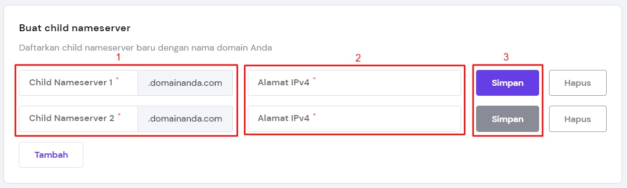 Untuk membuat child nameserver, masukkan informasi berikut ini pada kolom yang tersedia: