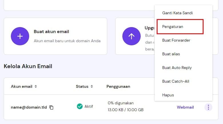 Jika And bisa mengirim email tetapi tidak bisa menerima email, mungkin saja ada beberapa kendala pada pengaturan akun email Anda. Untuk memeriksanya, buka Email → nama domain, lalu klik ikon pada email yang ingin diperiksa. Kemudian pilih Pengaturan: