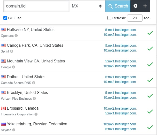 Pastikan tidak ada masalah pada pengaturan email Anda. Buka DNSChecker dan cek value MX record domain Anda. Jika Anda menggunakan MX record default Hostinger, hasil yang ditampilkan akan terlihat seperti berikut: