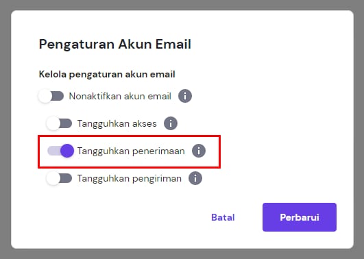Jika toggle Tangguhkan penerimaan diaktifkan, klik toggle untuk menonaktifkannya, dan simpan perubahan.