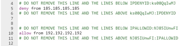 Pada file .htaccess Anda, tambahkan baris spesifik untuk mengizinkan atau memblokir alamat IP tertentu, dan jangan hapus baris-baris tersebut