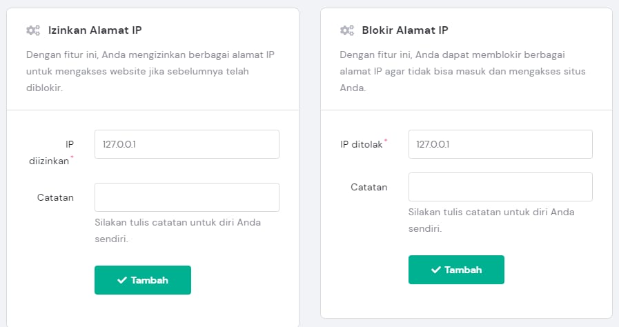 Masukkan IP, tinggalkan catatan (opsional), dan klik Tambah. Daftar IP dan tindakan yang ditentukan akan ditampilkan seperti berikut: