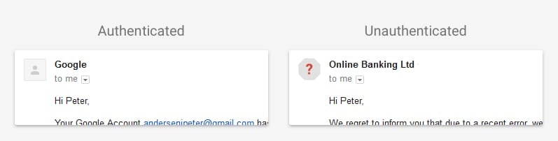 Jika email yang dikirim tidak diautentikasi, Gmail akan menampilkan tanda tanya “?” berwarna merah di sebelah nama pengirim email: