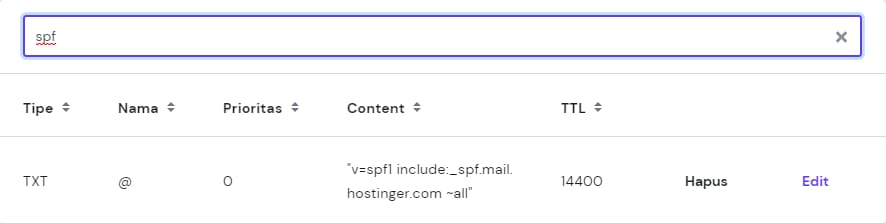Jika domain Anda sudah diarahkan ke nameserver Hostinger, maka SPF record akan ditambahkan secara default. Lihat informasi record dengan mengetik ”spf” di kolom pencarian DNS Zone Editor: