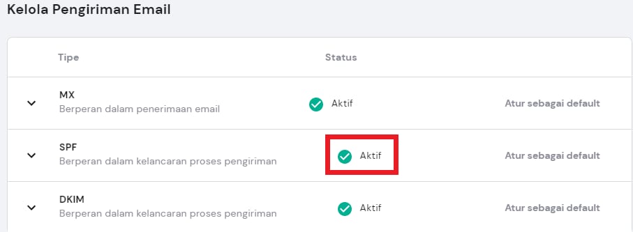 Jika SPF record sudah benar dan proses propagasi sudah selesai, status record akan berubah menjadi Aktif: