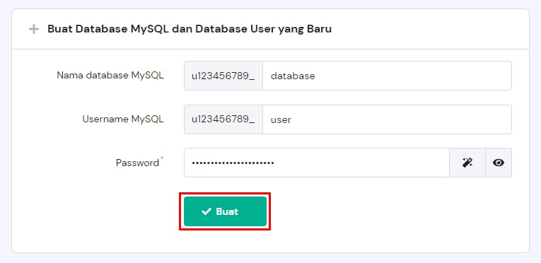 Pada bagian Buat Database MySQL dan Database User yang Baru, masukkan nama, username, dan password database MySQL. Setelah itu, klik Buat: