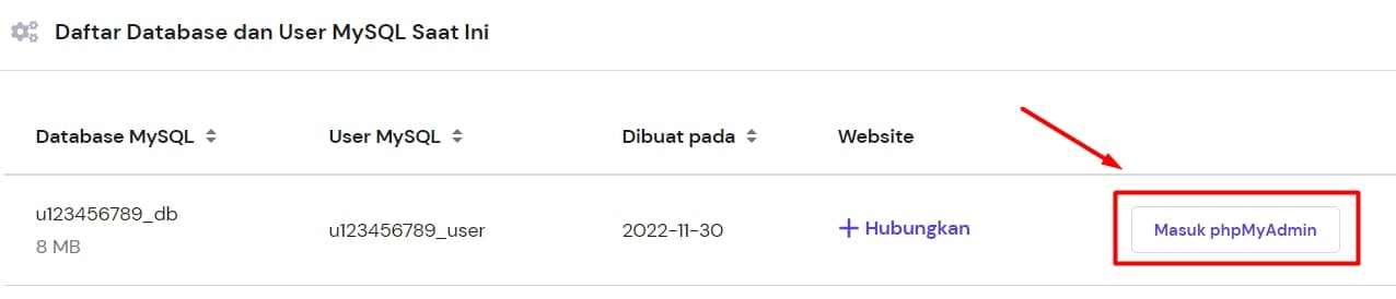 Dan klik Masuk phpMyAdmin di samping database:
