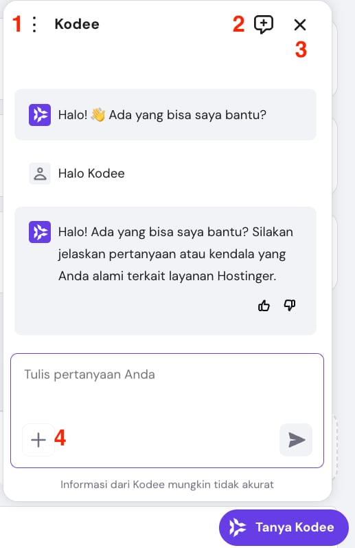 Klik Tanya Kodee untuk membuka jendela chat dan memulai percakapan dengan Kodee, AI assistant kami. Jelaskan secara singkat kendala dan pesan error yang Anda temui, Kodee akan membantu menemukan solusi terbaik untuk Anda.