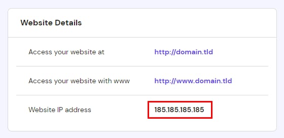 185.185.185.185 adalah alamat IP hosting dan domain.tld adalah nama domain Anda. Anda dapat menemukan alamat IP di hPanel melalui menu Website → Kelola→ Informasi paket: