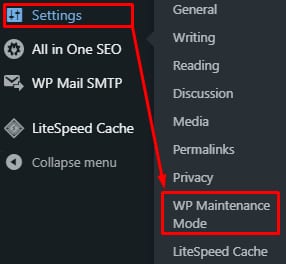 Setelah plugin diaktifkan, klik Settings di menu sebelah kiri dan pilih WP Maintenance Mode: