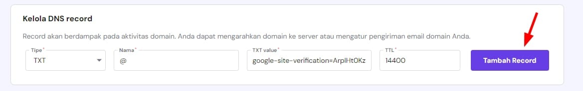 TXT Value: tempel kode verifikasi yang tadi Anda salin dari Google Search Console