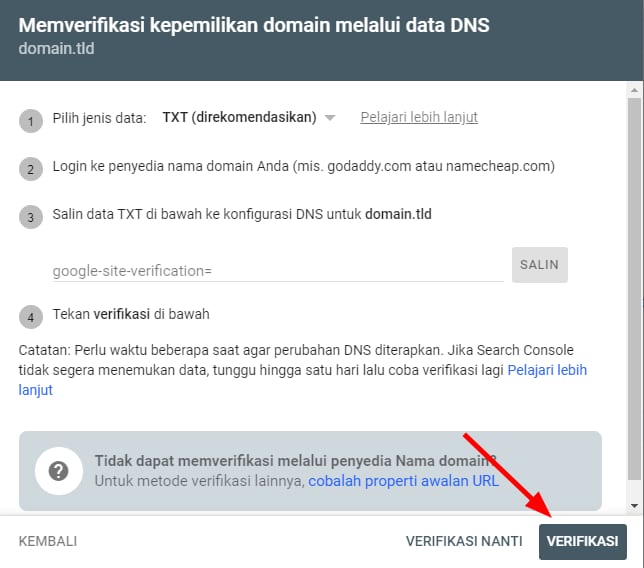 Setelah beberapa menit, kembali ke Google Search Console dan klik Verifikasi: