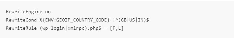 GeoIP memiliki berbagai kegunaan, salah satunya, jika Anda ingin memblokir akses ke file wp-login.php dan xmlrpc.php WordPress Anda dari negara selain Britania Raya (UK), Amerika Serikat, dan India, tambahkan kode berikut di file .htaccess Anda: