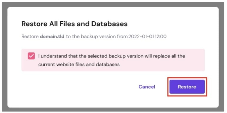 Anda akan melihat peringatan sebelum proses Pemulihan dilakukan. Jika website sudah siap dipulihkan, centang kotak dan klik Restore: