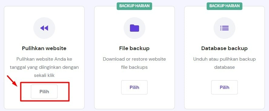 Dengan fitur Pulihkan Website, Anda bisa memulihkan file dan data website WordPress ke tanggal yang diinginkan dengan sekali klik.