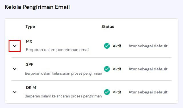 Untuk mengakses MX record default di akun Anda, buka Email → nama domain → Pengiriman Email, dan klik tanda panah ke bawah pad MX record: