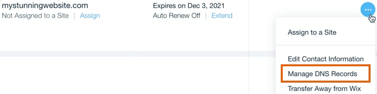 Apabila domain Anda terdaftar di Wix, DNS Zone dapat diakses melalui halaman Domain. Klik ikon Show More dan pilih Manage DNS Records: