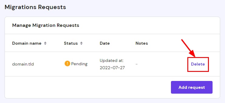 Klik Hapus (Delete) pada permintaan migrasi saat ini: