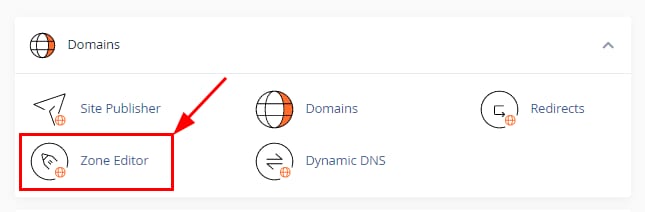 Untuk mengelola MX record, masuk ke menu Zone Editor yang dapat diakses melalui control panel. Buka cPanel dan cari bagian Domains -> Zone Editor: