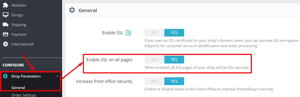 Pertama-tama, force website PrestaShop agar menggunakan HTTPS. Caranya, buka Configure → Shop Parameters → General. Setelah itu, pilih Enable SSL on all pages: