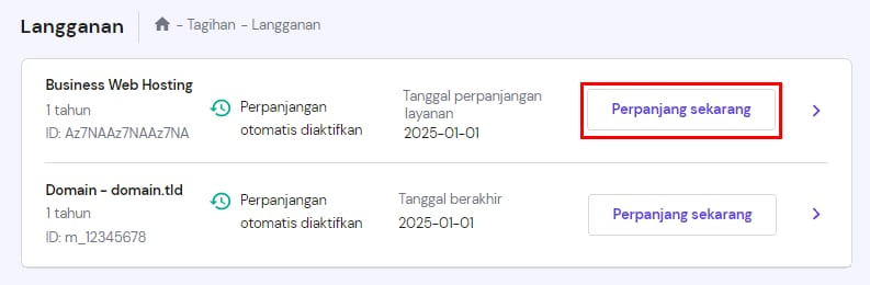 Bagian Langganan berisi daftar semua layanan aktif di akun Anda, status perpanjangan otomatis, dan tanggal kedaluwarsa. Anda juga dapat memperbarui domain atau hosting dengan mengeklik tombol Perpanjang sekarang :