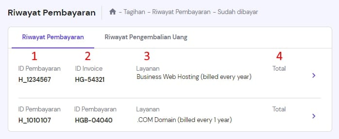 Pada Riwayat Pembayaran, Anda akan disajikan daftar semua pembayaran Anda sebelumnya. Anda juga dapat memeriksa faktur yang dikembalikan dananya dengan mengeklik tab Riwayat Pengembalian Uang.