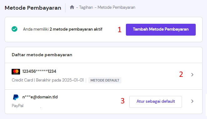 Di area Metode Pembayaran, Anda dapat mengelola metode pembayaran. Anda dapat menggunakan metode pembayaran tersimpan untuk membeli salah satu layanan kami hanya dengan satu klik. Selain itu, Anda dapat mengaktifkan perpanjangan otomatis untuk layanan Anda jika Anda menambahkan metode pembayaran aktif: