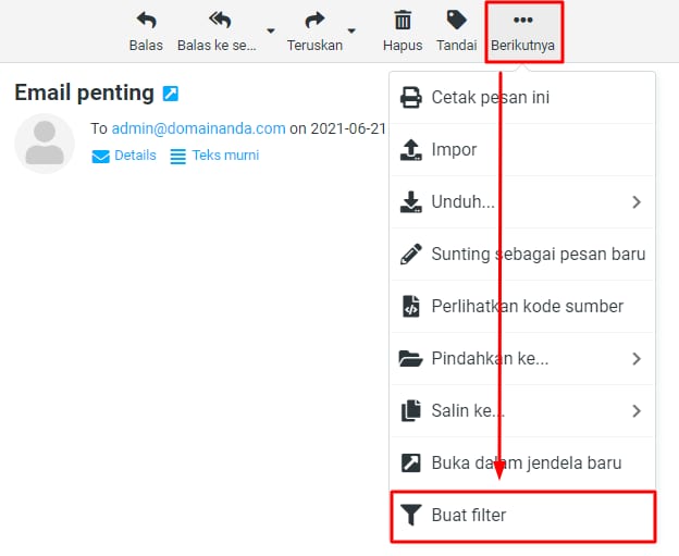Login ke Webmail → pilih email yang akan difilter → Berikutnya → Buat Filter: