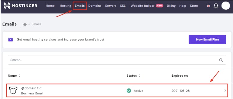 Untuk membeli akun tambahan menggunakan Titan Mail, buka bagian Email dan pilih domain Anda: