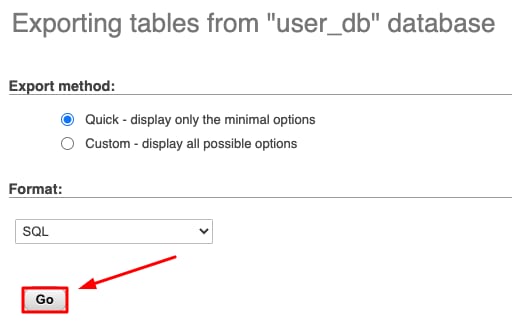 Jika ingin ekspor ke file SQL (file ini dibutuhkan untuk memindahkan database), klik Go: