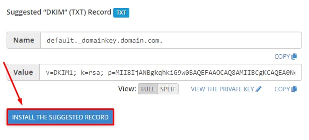 Jika ingin mengatur DKIM record default, scroll ke bawah dan pilih Suggested DKIM Record. Setelah itu, klik Install: