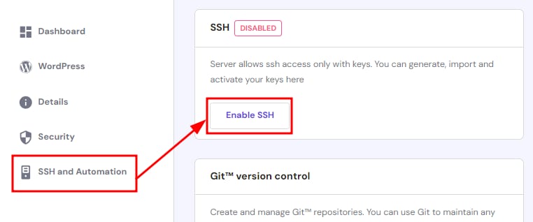 Jika Anda berlangganan paket shared hosting cPanel, login akun dan klik Halaman Utama → Kelola, cari SSH and Automation (SSH dan Otomatisasi) dan klik Enable SSH (Aktifkan SSH):