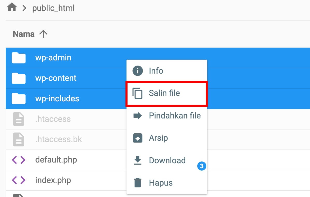 Aktifkan SSH Access terlebih dahulu, lalu hubungkan akun melalui SSH. Buka direktori file dan folder yang ingin disalin. Caranya: