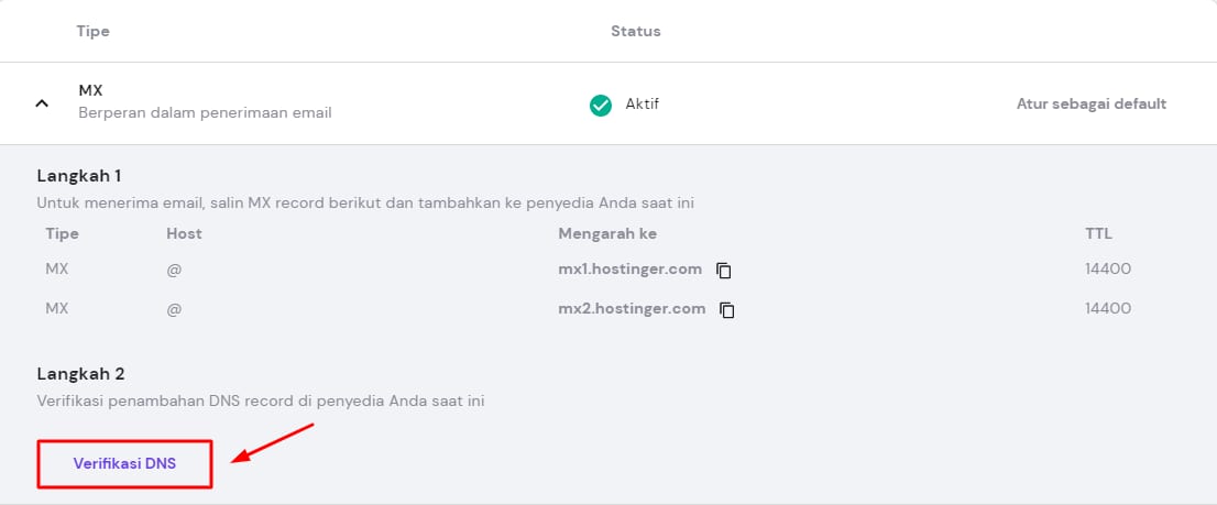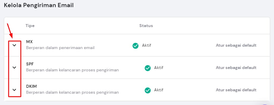 Jika domain diarahkan menggunakan NS record, semua detail MX, SPF, dan DKIM record akan otomatis ditambahkan.