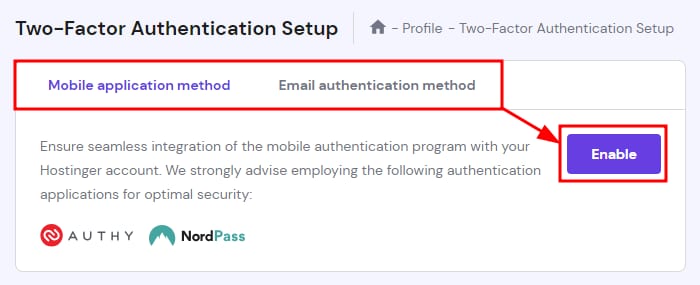 Autentikasi dua faktor adalah fitur keamanan tambahan yang melindungi akun dengan cara memastikan semua tindakan login ke akun Anda dilakukan oleh Anda sendiri, dan bukan orang lain. Untuk mengaktifkan autentikasi dua faktor, login ke akun Hostinger Anda.