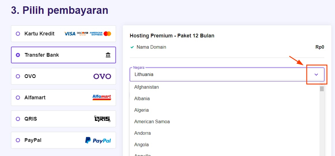 Setelah memilih periode paket dan berhasil membuat akun, Anda akan diminta untuk memilih metode pembayaran. Pilih negara Anda di daftar yang tersedia: