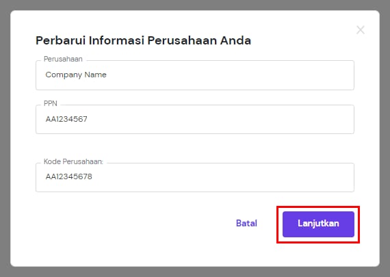 Penting! Kode Perusahaan harus diisi. Jika Anda tidak memiliki Kode Perusahaan, Anda dapat memasukan kode PPN ke bagian Kode Perusahaan.